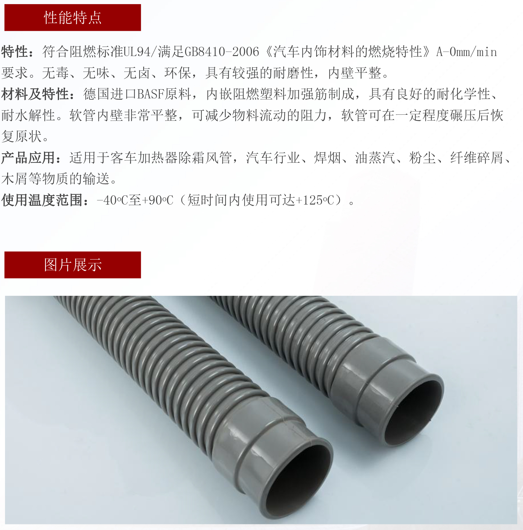 材料特性:采用德國BASF阻燃PU原料,內(nèi)嵌阻燃塑料加強(qiáng)筋制成,具有耐化學(xué)性,耐水解性。軟管內(nèi)壁非常平整,可減少物料流動(dòng)的阻力,軟管可在一定程度碾壓后恢復(fù)原狀。產(chǎn)品應(yīng)用:適用于冷風(fēng)及暖風(fēng)的輸送,汽車行業(yè)、焊煙、油蒸汽、粉塵、纖維碎屑、木屑等物質(zhì)的輸送。